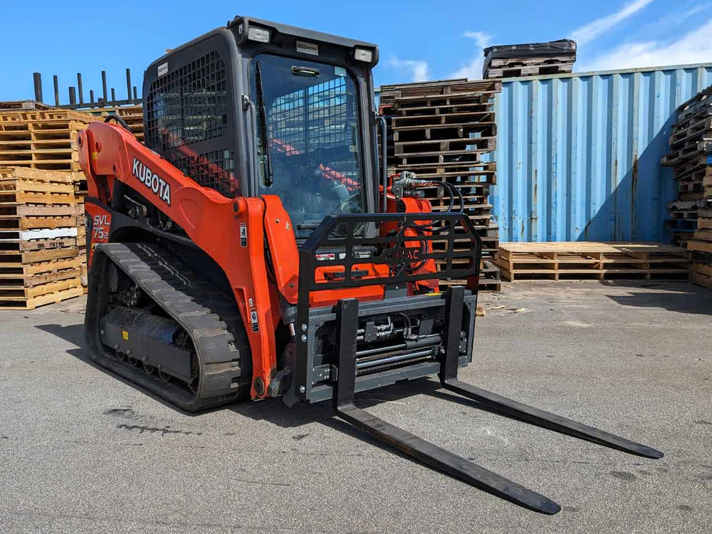 Skid steer forks are available for the SVL-70 and KC-70 compact loaders for material handling, pallet movement, lumber delivery, and other site-loading applications where compact loader fork capability is needed.